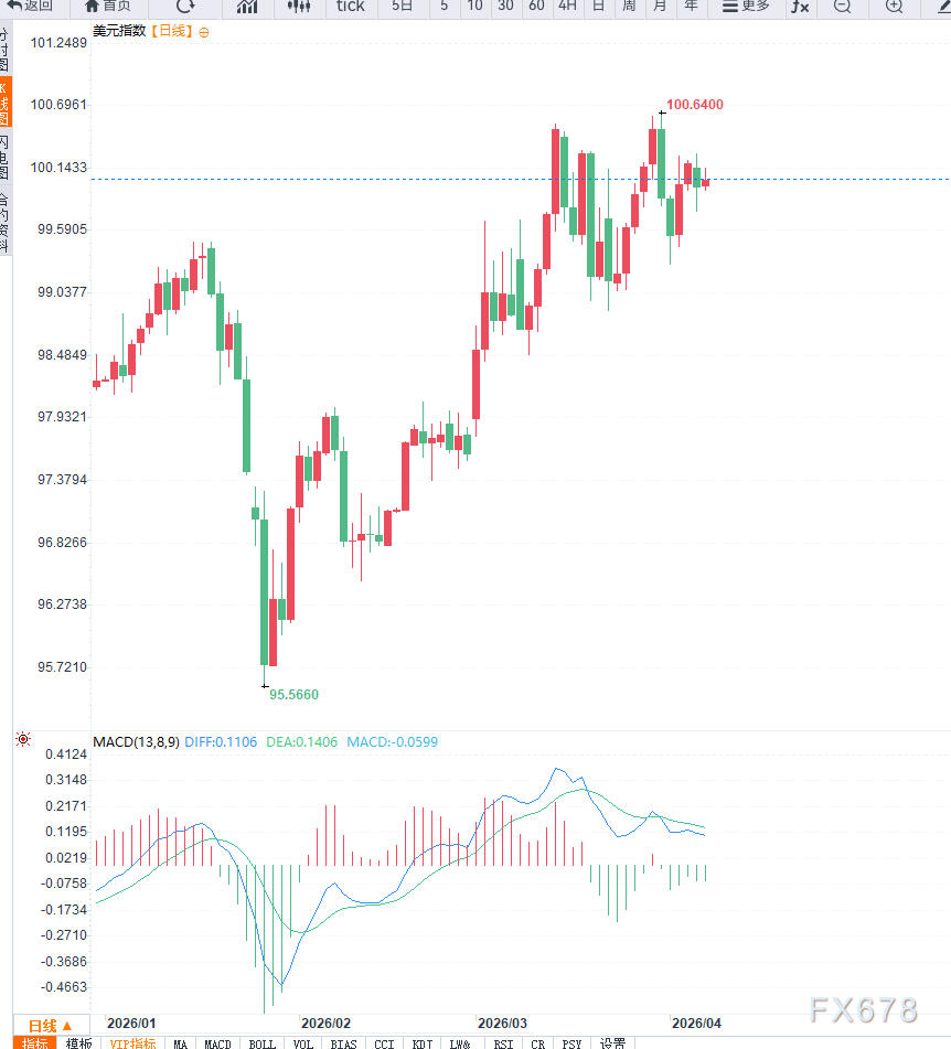 汇通财经APP讯——周二亚洲时段,好意思元指数升至100.10隔壁,不绝近期反弹走势。面前好意思元走势主要由避险需求与利率预期共同驱动,在复杂宏不雅布景下守护相对强势。